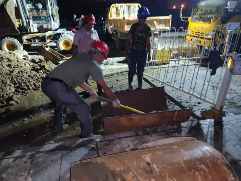 在快速挖開路面找出供水主管道后,經技術人員現場分析判斷,確定此次DN600供水主管道被施工損壞是因孝武大道道路改造施工導致,其施工人員操作啄木鳥時不慎將水泥供水管道挖破。隨后技術人員迅速制定了維修方案,即采用DN800鋼管抱箍,快速水泥填充的方式修復。為縮減搶修時間,運行維護部共派出各類工程車輛5輛,搶修人員18名參與到此次搶修任務中。盡管已到深夜,氣溫仍接近30攝氏度,但搶修人員不顧疲勞和炎熱,搶時間、趕進度,通宵作戰,終于在11日早上6點完成搶修任務,順利通水。