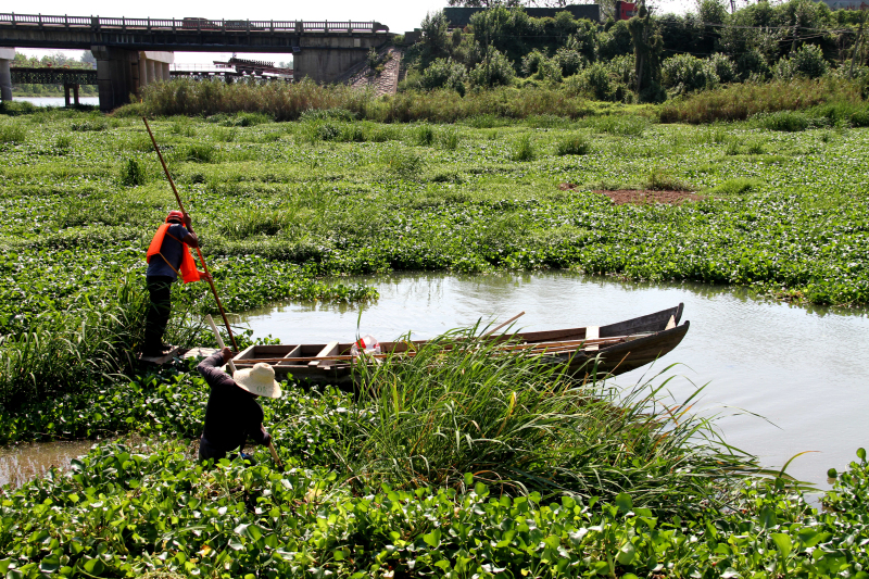 受下游橋梁施工截流及近期持續(xù)晴熱天氣影響,我市城區(qū)備用水源地淪河保護(hù)區(qū)內(nèi)水葫蘆大面積爆發(fā),將整個(gè)水面“霸占”得嚴(yán)嚴(yán)實(shí)實(shí),影響原水水質(zhì)安全。為清除隱患保障淪河應(yīng)急取水功能,在我公司高度關(guān)注和積極聯(lián)系下,淪河河長(zhǎng)辦、孝南區(qū)朱湖辦事處等部門迅速組織清剿隊(duì),自8月21日起與水葫蘆展開“會(huì)戰(zhàn)”。